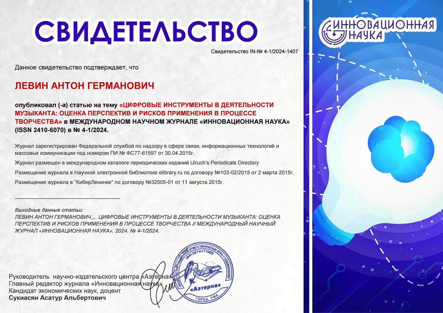My article "DIGITAL INSTRUMENTS IN THE ACTIVITY OF A MUSICIAN: ASSESSMENT OF PROSPECTS AND RISKS OF APPLICATION IN THE CREATIVE PROCESS" was published in the International scientific journal INNOVATIVE SCIENCE issue april 2023. In this article I tried to do a little research in the field of using new technologies, musical instruments, specialized programs in writing music, even in a "remote format".